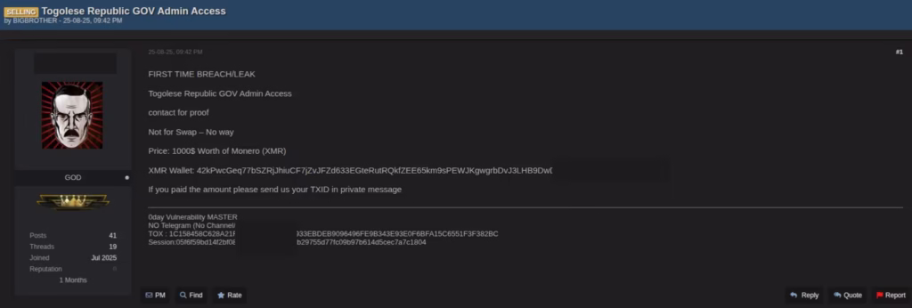 (Lomé Actu) – Depuis le 28 août 2025, une information relayée par la plateforme CyberAlert Côte d’Ivoire agite la sphère numérique : un pirate informatique, se présentant sous le pseudonyme BIGBROTHER, aurait proposé sur le Dark Web la vente d’un accès administrateur aux systèmes du gouvernement togolais.
